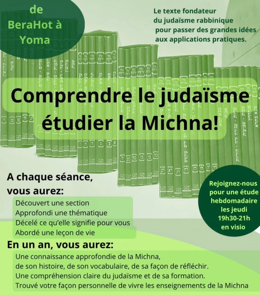Vous y trouverez l’ensemble des rendez-vous du mois : les cours proposés par la rabba Floriane Chinsky — le lundi pour l’étude de la Torah et le jeudi pour l’étude de la Michna —, ainsi que les événements ouverts à tous et ceux réservés aux membres de la communauté.